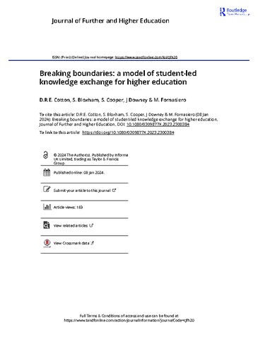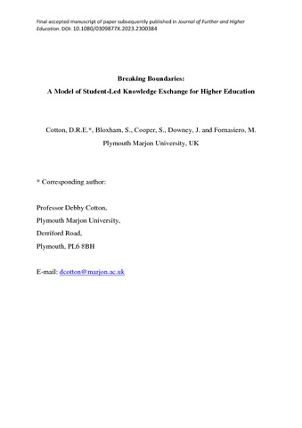 Cotton, Debby, Bloxham, Saul, Cooper, Susan, Downey, John and Fornasiero, M. (2024) Breaking boundaries: a model of student-led knowledge exchange for higher education. Journal of Further and Higher Education. pp. 1-14. ISSN 0309-877X