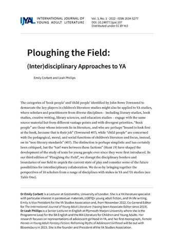 Corbett, Emily and Phillips, Leah (2022) Ploughing the Field: (Inter)disciplinary Approaches to YA Studies. The International Journal of Young Adult Literature, 3 (1). pp. 1-20. ISSN 2634-5277