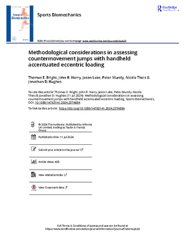 Bright, Thomas E., Harry, John R., Lake, Jason, Mundy, Peter, Theis, Nicola and Hughes, Jonathan D. (2024) Methodological considerations in assessing countermovement jumps with handheld accentuated eccentric loading. Sports Biomechanics. pp. 1-18. ISSN 1476-3141