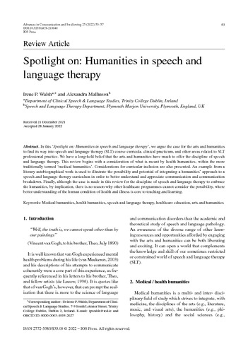 Walsh, Irene P. and Mallinson, Alex (2022) Spotlight on: Humanities in speech and language therapy. Advances in Communication and Swallowing, 25 (1). pp. 53-57. ISSN 2772-5391